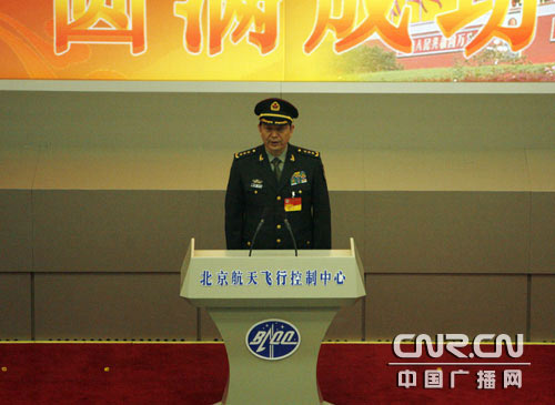 載人航天工程總指揮、中央軍委委員、解放軍總裝備部部長常萬全部長宣布神舟七號載人航天飛行任務(wù)結(jié)果。(中廣網(wǎng)記者南光 曹囡囡攝)