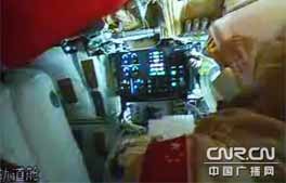 神七艙外看美麗地球 艙內(nèi)航天員就餐