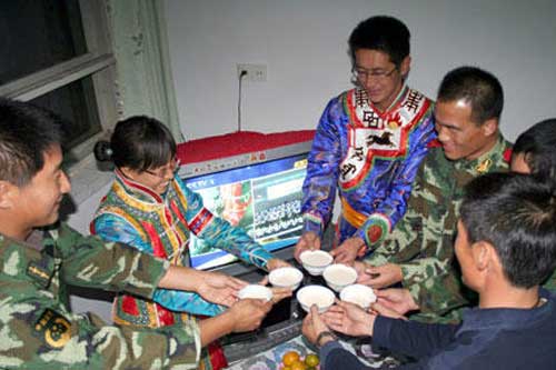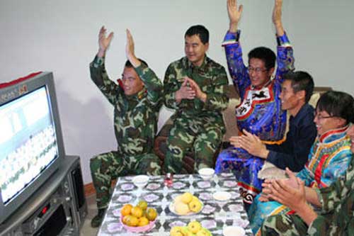 9月25日,內(nèi)蒙古烏蘭察布市公安邊防支隊官兵與當?shù)啬撩裢嬆滩铓g慶“神七”成功發(fā)射。