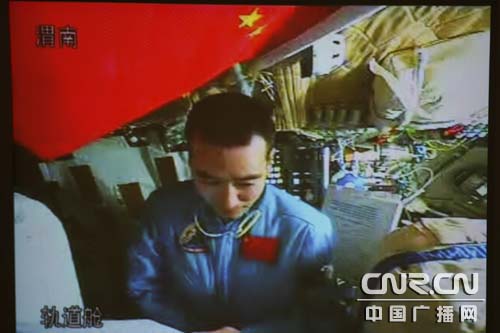 航天員翟志剛正在軌道艙測(cè)試天地通話的性能 中廣網(wǎng)記者南光 曹囡囡 攝