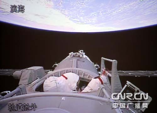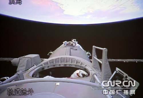 航天員翟志剛正在出艙。(中廣網(wǎng)記者南光 曹囡囡攝)