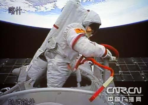 航天員翟志剛解開安全掛鉤。(中廣網(wǎng)記者南光 曹囡囡攝)