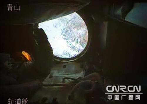 航天員翟志剛回到艙內(nèi),透過艙門依然看到艙外的美麗地球。(中廣網(wǎng)記者南光 曹囡囡攝)