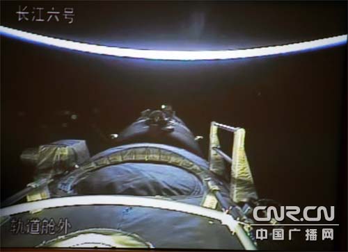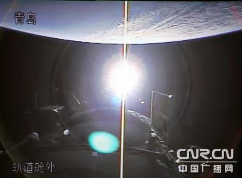圖為太空日落的壯觀景象。金色的太陽給地球和神舟七號鑲上了金邊,分外美麗。(中廣網(wǎng)記者南光 曹囡囡攝)