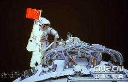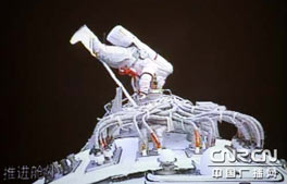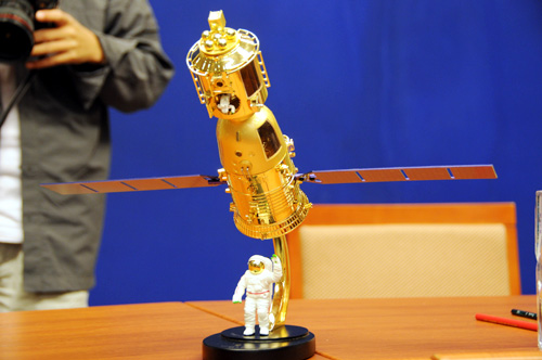 2008年9月27日(星期六)晚8時30分,國務(wù)院新聞辦公室舉行發(fā)布會。請中國載人航天工程辦公室副主任、載人航天工程新聞發(fā)言人王兆耀介紹神舟七號飛船運行、航天員出艙活動等情況,并答記者問。圖為發(fā)布會主席臺上的神七模型。新華網(wǎng) 王翰林 攝