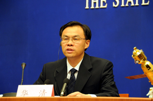 2008年9月27日(星期六)晚8時30分,國務(wù)院新聞辦公室舉行發(fā)布會。請中國載人航天工程辦公室副主任、載人航天工程新聞發(fā)言人王兆耀介紹神舟七號飛船運行、航天員出艙活動等情況,并答記者問。圖為國新辦新聞局副局長華清主持本次發(fā)布會。新華網(wǎng) 王翰林 攝