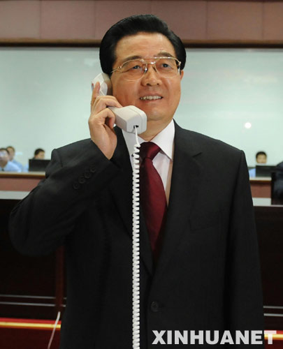 這是胡錦濤在航天員出艙活動結束后同他們親切通話,對成功出艙表示熱烈祝賀。新華社記者李學仁攝