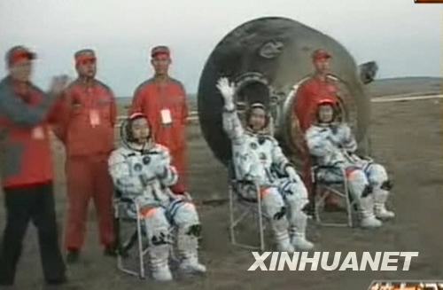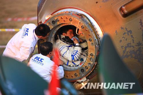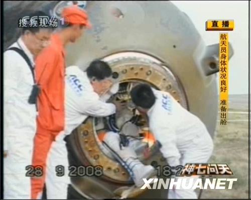 9月28日,神七返回艙艙門打開。航天員出艙。新華社發(fā)(電視截圖)