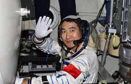 | ·劉伯明在軌道艙內(nèi)穿艙外航天服配合翟志剛出艙活動(dòng) |
