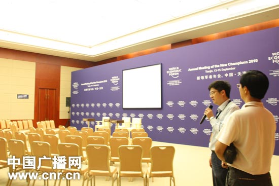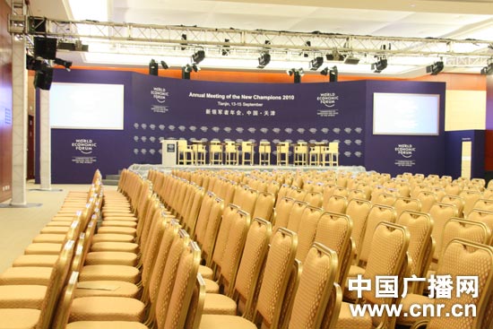 15日,2010夏季達(dá)沃斯論壇的閉幕式將在這間名為“達(dá)沃斯”的會議廳舉行。(中廣網(wǎng)記者朱虹 攝)