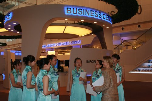 2010夏季達沃斯(新領(lǐng)軍者年會)9月13-9月15日在天津舉辦,主題為“推動可持續(xù)增長”。作為夏季達沃斯官方網(wǎng)絡(luò)媒體合作伙伴和官方互動平臺,騰訊財經(jīng)對本次論壇進行全程網(wǎng)絡(luò)直播。圖為達沃斯新領(lǐng)軍者村內(nèi),禮儀小姐正在接受領(lǐng)隊培訓。