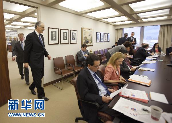 5月18日,國際貨幣基金組織(IMF)代總裁約翰·利浦斯基(左二)在美國華盛頓出席日常會議。 IMF18日發(fā)表聲明說,在該組織總裁斯特勞斯-卡恩被捕后,第一副總裁約翰·利浦斯基目前主持該組織日常工作。 新華社/路透