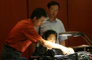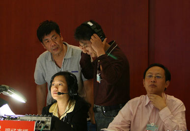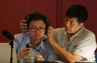 技術(shù)中心周俊生給經(jīng)濟(jì)之聲記者黃耀偉戴監(jiān)聽(tīng)耳機(jī)