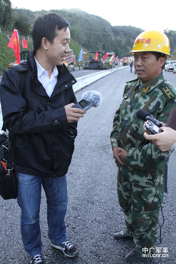 中央臺記者孫杰采訪武警交通部隊官兵(中央臺記者劉鵬攝)