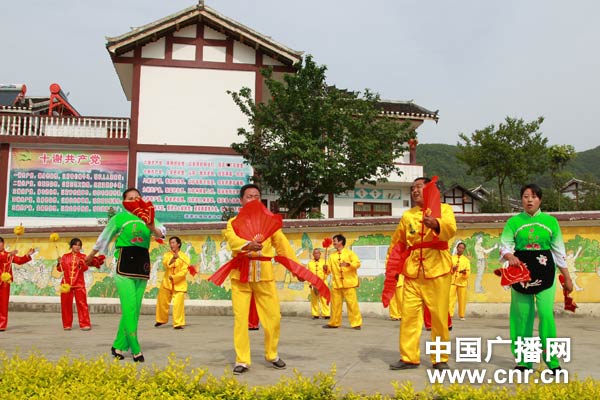 依靠茶園經(jīng)濟逐漸富裕起來的田家溝村民們正在演出自編的黔東花燈“十謝共產(chǎn)黨”歌謠。這或許是富裕起來的茶農(nóng)們心意的最好寫照。(中廣網(wǎng)記者涂傲 攝)