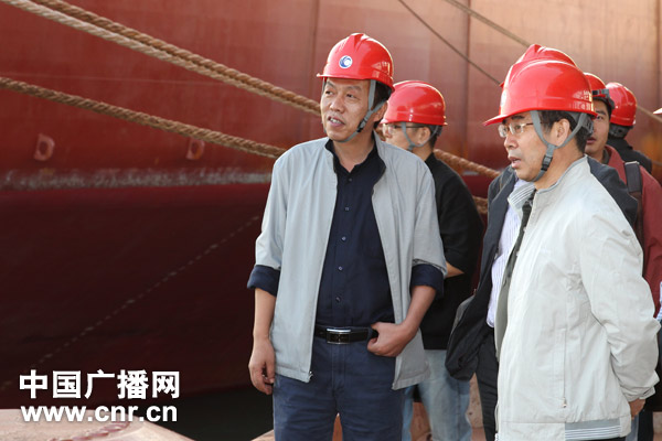 中央人民廣播電臺“喜迎十八大走基層轉(zhuǎn)作風(fēng)改文風(fēng)”《傾聽河北》采訪團(tuán)成員、中國之聲總監(jiān)蔡小林在河北曹妃甸礦石碼頭采訪