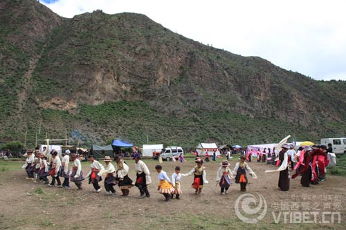 七、八月份的昌都地區(qū),氣候宜人,莊稼黃熟,百花盛開。此時,在婆娑古樹下,在山野花叢中,在如茵草地上,到處都可以見到穿戴鮮艷民族服裝的群眾合家而出,搭上白色的帳篷,跳起歡快的鍋莊,一連數(shù)天野營在草壩上,通宵達(dá)旦,狂歡極樂。