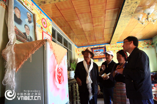 扎桑和旺堆羅布向記者介紹胡錦濤總書記2001年贈送給他們的三代領導人畫像。記者 小邊巴/攝