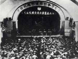 1945年4月23日至6月11日,中國(guó)共產(chǎn)黨第七次全國(guó)代表大會(huì)在延安楊家?guī)X中央大禮堂召開(kāi),歷時(shí)50天。出席大會(huì)的正式代表547名,候補(bǔ)代表208名,共計(jì)755名,代表全國(guó)121萬(wàn)黨員。大會(huì)選出毛澤東、朱德、劉少奇、周恩來(lái)、任弼時(shí)、林伯渠、彭德懷、康生、陳云、陳毅、賀龍、徐向前、高崗、張聞天、彭真15人組成主席團(tuán),選舉任弼時(shí)為大會(huì)秘書長(zhǎng)、李富春為副秘書長(zhǎng)。