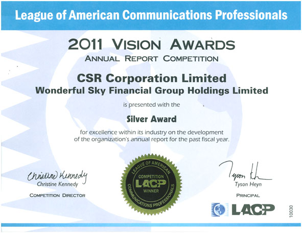 中國南車2011年年度報告在本屆評選中獲得97分(評選為百分制),在“致股東書函、內(nèi)文敘述、財務摘要、創(chuàng)意設計、信息易讀性“等單項中均獲得滿分。LACP的總經(jīng)理Christine Kennedy表示:“中國南車在今年的激烈競爭中表現(xiàn)卓越,以優(yōu)異的水準獲得評委的青睞,總體上看,中國南車這次的表現(xiàn)接近完美。我們認為中國南車在本次比賽中的表現(xiàn)是這個行業(yè)當中最優(yōu)秀的”。美國媒體專業(yè)聯(lián)盟年度報告“遠見獎”是備受業(yè)界尊崇的年報評選國際獎項之一,由世界著名營銷調(diào)查機構——美國通訊聯(lián)盟公司組織評選,在業(yè)界年報選舉中擁有重要地位。