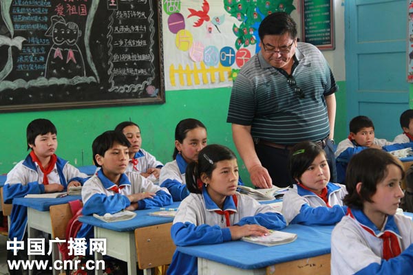 采訪團(tuán)成員,新疆記者站站長胡志堅在采訪現(xiàn)場了解雙語教學(xué)情況