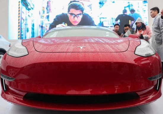 資料圖:人們在特斯拉上海超級工廠(一期)奠基儀式現(xiàn)場觀看展出的Model 3車型。 (新華社)