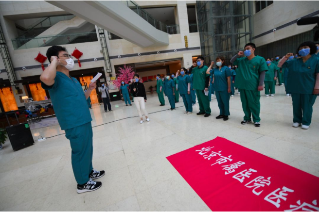 3月6日是援鄂醫(yī)療隊(duì)抵達(dá)武漢的第40天。醫(yī)療隊(duì)員們?cè)隈v地大廳排開(kāi)隊(duì)列,擺出了“北京”字形,以這樣的形式彰顯北京醫(yī)護(hù)人員的團(tuán)結(jié)拼搏精神,劉壯帶領(lǐng)大家重溫了醫(yī)學(xué)生誓言。