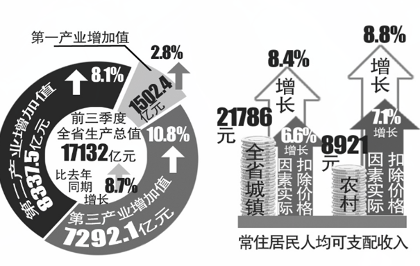 作為拉動經(jīng)濟增長的主導(dǎo)力量,前三季度,全省規(guī)模以上工業(yè)實現(xiàn)增加值7192.7億元,增長8.6%,增幅比全國高2.6個百分點,居全國第6、中部第2位。分行業(yè)看,汽車增幅最大,為25.3%;家用洗衣機和彩電增速超過10%。前三季度,全省固定資產(chǎn)投資19706.5億元,增長11.5%,增幅與上半年持平,比全國高3.3個百分點。和上半年相比,房地產(chǎn)投資熱度稍減,但銷售持續(xù)火爆,去庫存效果顯著。 9月末,商品房待售面積2426.9萬平方米,比6月末減少136.4萬平方米。