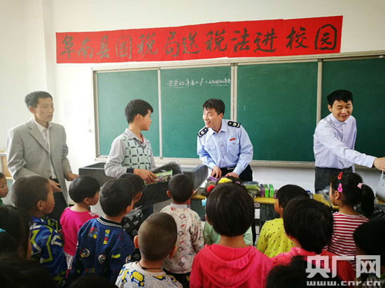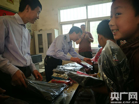阜南縣國稅局局長陳東康和愛心企業(yè)給孩子們發(fā)送文具