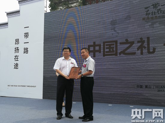 在啟動儀式上,中國文化管理協(xié)會執(zhí)行副主席路建平給車隊成員贈送汪永亨絲綢卷軸,并給車隊授旗;黃山市委書記任澤鋒向中國文化管理協(xié)會副主席李新樂贈送“中國之禮·黃山邀請”;已創(chuàng)作65個“一帶一路”沿途國家重彩山水畫的安徽籍著名畫家李恒,向黃山市委常委、宣傳部長路海燕贈畫《黃山雄風(fēng)》,“從黃山到遠山”畫展也正式啟動;黃山市委常委、秘書長、統(tǒng)戰(zhàn)部長周天偉與國融證券董事長侯守法揭幕車身“夢幻黃山 禮儀徽州”;譚玉平與奉佑生共同啟動“映象絲路”直播;上,敻曷√卮善骺偨(jīng)理趙春陽給車隊成員贈送“絲路寶船”國瓷。被納入中國之禮的還有來自云南保山的“萬里紅”茶葉和高科技功能面料制成的威森戴樂服飾。