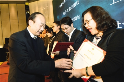 中國(guó)書刊發(fā)行業(yè)協(xié)會(huì)理事長(zhǎng)艾立民為年度出版社頒獎(jiǎng)。