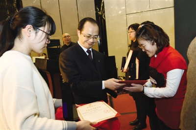 原中國(guó)新聞出版總署副署長(zhǎng)、中國(guó)期刊協(xié)會(huì)會(huì)長(zhǎng)石峰為成都市委宣傳部常務(wù)副部長(zhǎng)、文明辦主任張映明頒獎(jiǎng)。