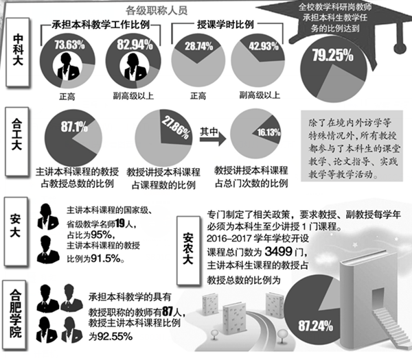 據(jù)安徽商報(bào)報(bào)道 省教育廳日前公布高校 2016-2017學(xué)年本科教學(xué)質(zhì)量報(bào)告。通過報(bào)告可以看出,大學(xué)教授們承擔(dān)本科教學(xué)工作的比例多在八成以上。