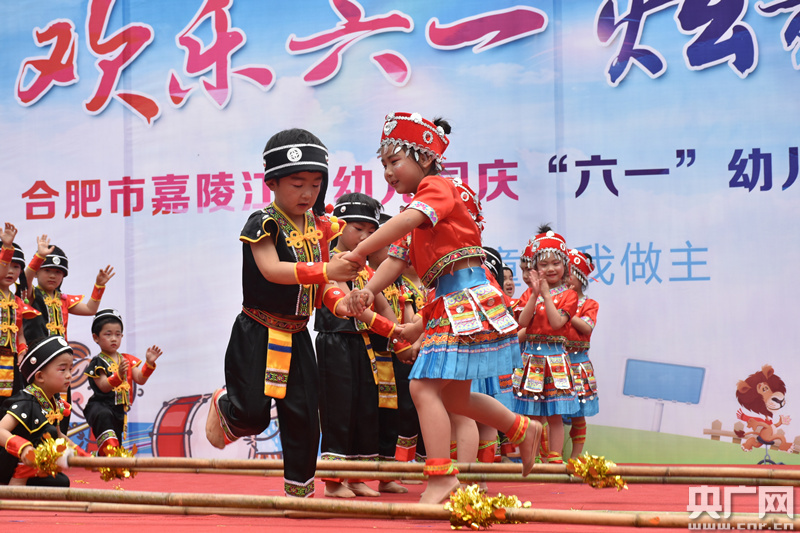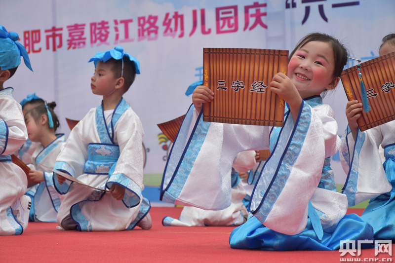 活動(dòng)現(xiàn)場,來自合肥市嘉陵江路幼兒園的小朋友們,在舞臺(tái)上用靈動(dòng)優(yōu)美的舞蹈慶祝專屬自己的節(jié)日。一個(gè)個(gè)或化身小蜜蜂,或扮成小書童演繹經(jīng)典舞蹈;場上民族風(fēng)和現(xiàn)代風(fēng)穿插,相得益彰。舞臺(tái)下,觀眾們歡聲笑語不斷,和孩子們共同歡度六一。(任蘭 攝)