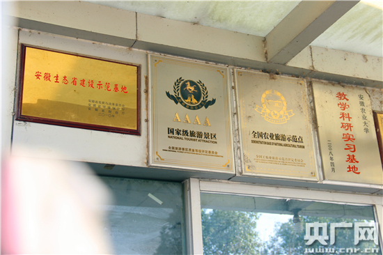 門右側(cè)窗口是“游覽接待中心”和“售票大廳”,墻上掛著的一塊由全國旅游景區(qū)質(zhì)量評定委員會授予的“AAAA國家級旅游景區(qū)”標牌,記錄著這里過去所擁有的輝煌。但此時,落滿塵土的它,早已失去了往日的價值。