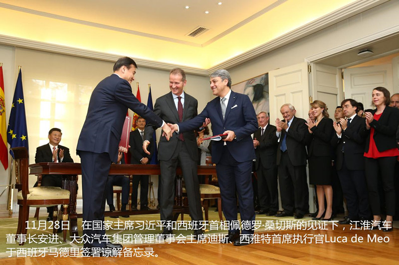11月28日,在中國(guó)國(guó)家主席習(xí)近平和西班牙首相佩德羅·桑切斯的見(jiàn)證下,江淮汽車集團(tuán)股份有限公司與大眾汽車集團(tuán)(中國(guó))及西雅特汽車公司在西班牙巴塞羅那簽署諒解備忘錄。