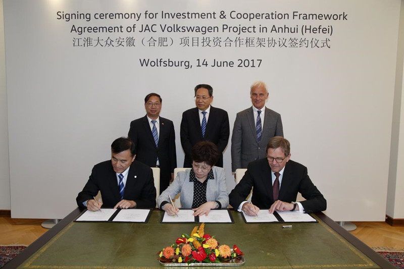 2017年6月1日,在李克強(qiáng)總理和德國(guó)總理默克爾的共同見(jiàn)證下,江淮汽車集團(tuán)股份有限公司與大眾汽車集團(tuán)在德國(guó)柏林正式簽署合資企業(yè)協(xié)議,雙方共同成立一家股比各占50%的合資企業(yè),進(jìn)行新能源汽車的研發(fā)、生產(chǎn)和銷售。