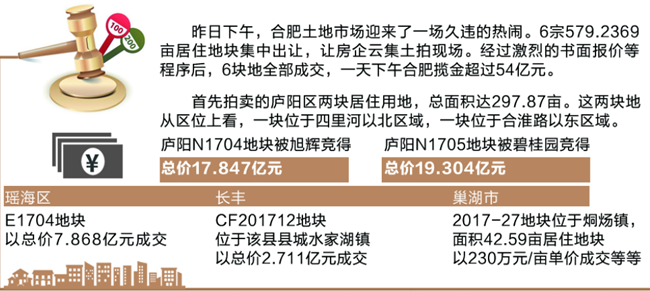 昨日,合肥1月份最后一場土地拍賣圓滿“收官”,六宗地塊使用權(quán)成功轉(zhuǎn)讓,共攬金54.44億元。超過30家的房地產(chǎn)企業(yè)參與“搶地大戰(zhàn)”,其中,廬陽區(qū)超百畝居住用地(位于合淮路以東、棗園路以南)引來十幾家開發(fā)企業(yè)爭搶,最終“花落”旭輝地產(chǎn),最高樓面價達(dá)到10752元/平方米。合經(jīng)區(qū)88.13畝商業(yè)、居住用地(宿松路以西、紫蓬路以南),將會引進(jìn)醫(yī)療手術(shù)機(jī)器人運營企業(yè)區(qū)域總部、研發(fā)中心和應(yīng)用推廣中心入駐。