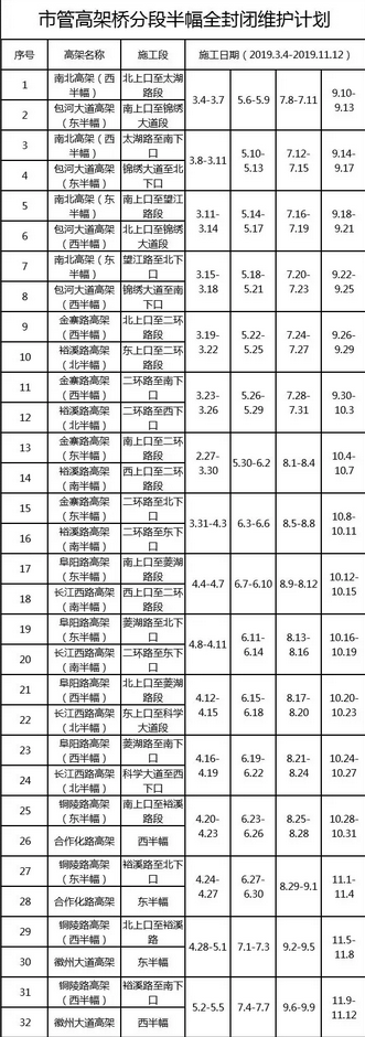 為保證高架橋道路安全運行和市民安全出行,經(jīng)合肥市人民政府批準,擬定于2019年3月至11月,對南北高架、包河大道高架等九條高架橋道路進行四個周期部局養(yǎng)護修繕。依據(jù)《中華人民共和國道路交通安全法》第三十九條、《中華人民共和國道路交通安全法實施條例》第三十五條之規(guī)定,現(xiàn)就道路施工相關(guān)事項公告如下: