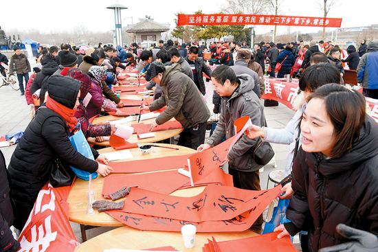 1月24日,淮南市文化科技衛(wèi)生“三下鄉(xiāng)”集中示范活動在壽縣舉行,該市文化、科技、衛(wèi)生等部門結合職能開展為民服務,助力精準扶貧。(圖為淮南市書法家現(xiàn)場為壽縣農民寫春聯(lián)。特約攝影陳彬)