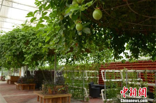 在產業(yè)園一旁,是對外展示的光伏農業(yè)智能溫室大棚,郁郁蔥蔥的各類植物,是占地面積300畝的大棚內的主角,大棚里小橋流水,曲徑通幽,各種植物高低錯落,甚至還有來自熱帶的椰子樹、仙人掌等。