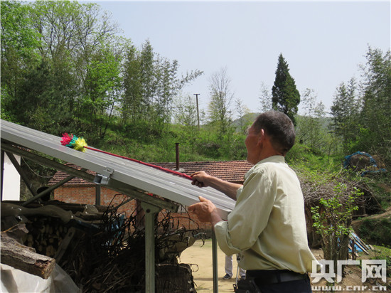 陳澤申清理自家門前光伏發(fā)電板上的灰塵