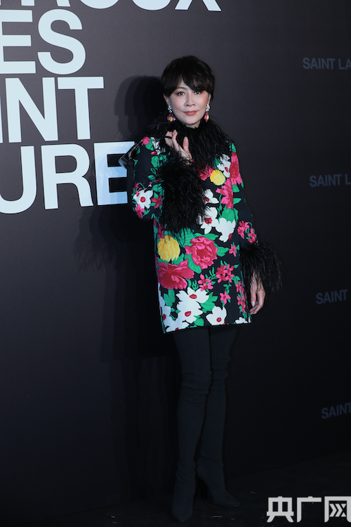 劉嘉玲以品牌2021春夏系列中的一件印花連身小禮服亮相,領(lǐng)口與袖口的夸張羽毛裝飾十分搶鏡。