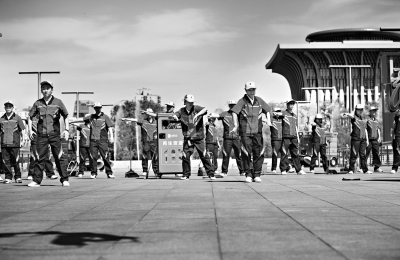 北京日?qǐng)?bào)訊(記者 劉可)昨天15時(shí)許,伴隨著一組清新、活潑的和聲,百余名身著工服的環(huán)衛(wèi)工人手持掃把、便攜式簸箕,手推垃圾箱跳起了歡快的舞步。國(guó)內(nèi)首次由環(huán)衛(wèi)職工發(fā)起的主題“快閃”活動(dòng)亮相奧林匹克公園中心區(qū),短短10分鐘的表演吸引了不少游客的駐足觀賞。