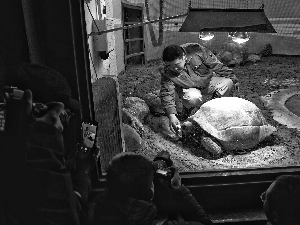 食蟻獸沒有絨毛,看似挺長的尾巴其實都是硬刺,專用來遮擋毒辣的陽光,因此他們最怕冷。食蟻獸的房間里既有暖氣又有浴霸,10歲的南南吃完早餐正在散步,一副愜意的樣子。象龜?shù)募冶仁诚伀F家多了暖風(fēng)設(shè)備,一進(jìn)獸舍恍若來到熱風(fēng)襲面的赤道地區(qū)(見圖)。飼養(yǎng)員說,這里的三頭象龜都來自塞舌爾,浴霸不僅供暖用,更起到“回家”的作用,“這些大家伙喜歡太陽的強(qiáng)光,浴霸的光對他們來說,就是太陽光,離不了!北y守宮和西非擬蜥這些爬行動物個頭都小巧,飼養(yǎng)員干脆把電線埋在“石頭”里,制作成發(fā)熱石,這些小家伙則更愿意趴在上面伸懶腰。