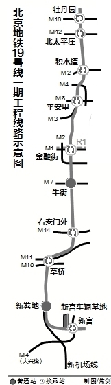 地鐵19號(hào)線分兩期建設(shè),一期由豐臺(tái)新宮至海淀牡丹園,全長(zhǎng)約22.4公里。全線設(shè)10座車站,其中8座為換乘站,分別為新宮(大興線)、新發(fā)地、草橋(新機(jī)場(chǎng)線、M10、M11)、右安門外(M14)、牛街、金融街(M1、M2、R1)、平安里(M6、M3、M4)、積水潭(M2)、北太平莊(M12)、牡丹園(M10)。