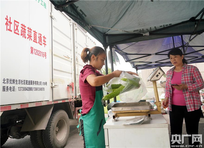 北京青龍橋街道軍科院社區(qū),居民正在選購社區(qū)蔬菜直通車產(chǎn)品。(央廣網(wǎng)記者 劉天思 攝)