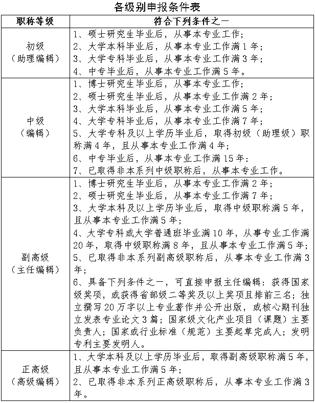 在職稱等級(jí)及名稱設(shè)置上,職稱等級(jí)從高到低依次設(shè)置為:正高級(jí)、副高級(jí)、中級(jí)、初級(jí)(助理級(jí))四個(gè)等級(jí),各級(jí)別專業(yè)技術(shù)資格名稱分別為:高級(jí)編輯、主任編輯、編輯、助理編輯等。