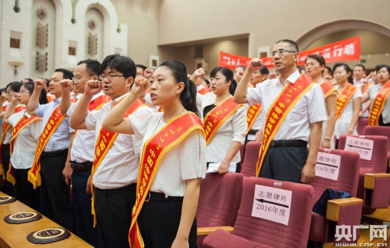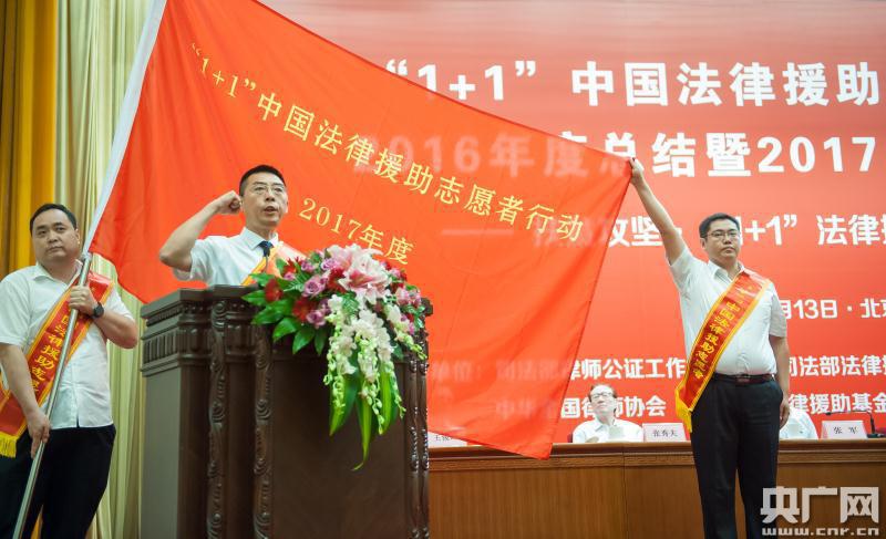 央廣網(wǎng)北京7月13日消息(記者孫瑩)據(jù)中國之聲《央廣新聞》報道,2017年度“1+1”中國法律援助志愿者行動啟動儀式在北京人民大會堂舉行,242名律師和大學(xué)生志愿者從司法部部長、黨組書記張軍手中接過了“1+1”中國法律援助志愿者行動旗幟,并莊嚴宣誓,他們將奔赴青海、西藏、新疆、貴州等14個。▍^(qū)、市)和新疆生產(chǎn)建設(shè)兵團的170多個縣(區(qū)),開展為期一年的法律援助志愿服務(wù),扶貧攻堅。