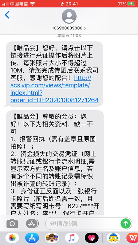 被騙后,受害者除了第一時間向警方報案外,還與唯品會聯(lián)絡(luò),質(zhì)疑其為何會把自己的隱私泄露?幾位受害人告訴記者,在他們向唯品會提交手持身份證照片等隱私數(shù)據(jù)后,唯品會向部分被騙用戶“墊付”了損失,并要求他們承諾,一旦警方破案拿到被騙款項,返還墊付款項。但李女士認為,把手持身份證照片給到唯品會,無疑又增加了一層隱私泄露的風險。李女士說:“承諾書的話就是本人身份證號、聯(lián)系電話、地址,本人在唯品會購物后,因輕信不法分子遭遇網(wǎng)絡(luò)詐騙,本人損失為多少。本人于幾月幾日向警方報案,報警回執(zhí),現(xiàn)在唯品會從客戶體驗角度出發(fā),預先向本人墊付,后面就是本人向唯品會承諾,如警方后續(xù)追款成功,本人將向唯品會退還警方追款成功的金額,否則唯品會有權(quán)通過法律途徑向本人予以追索全部墊付款。承諾人身份證號這些!